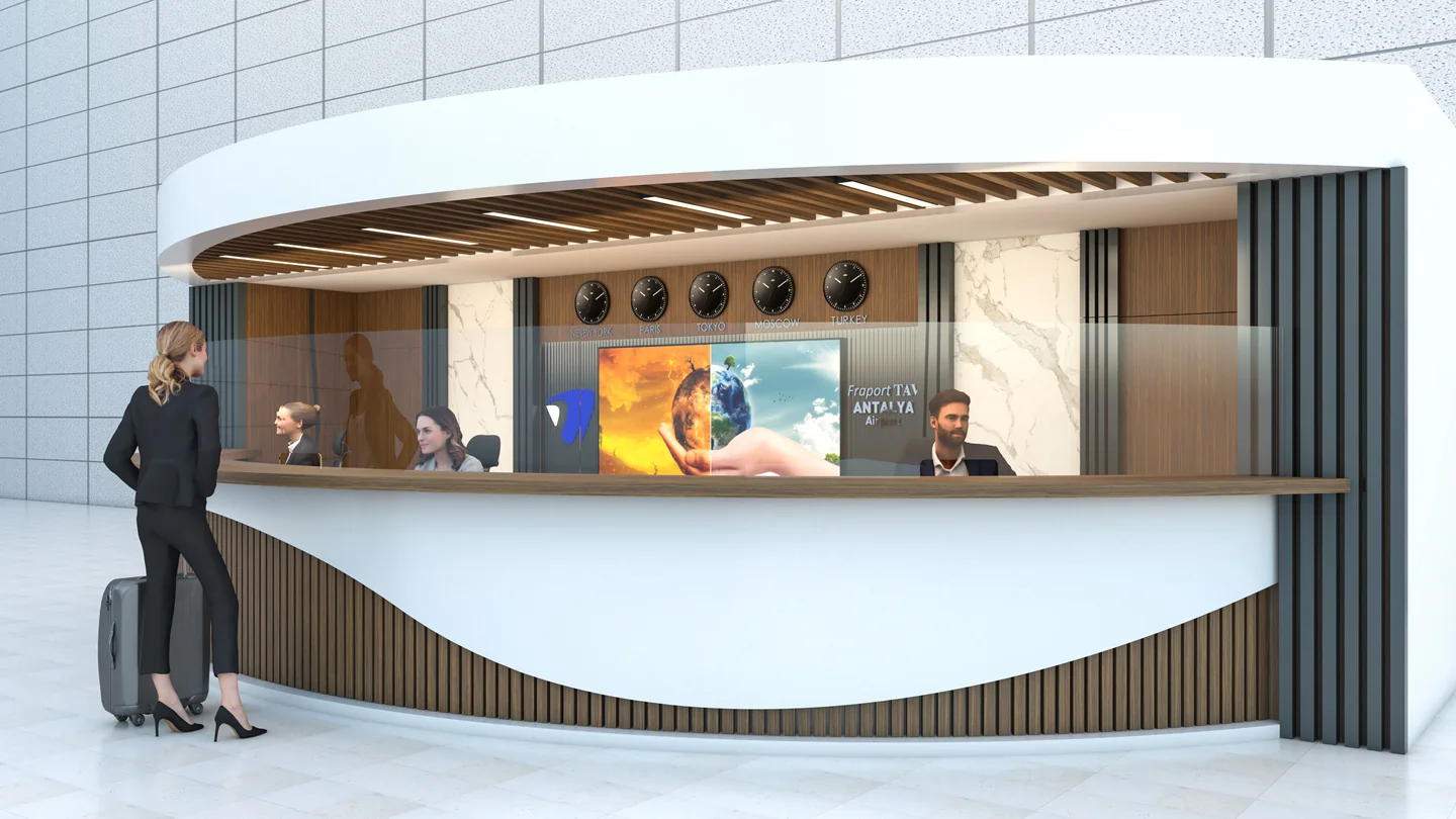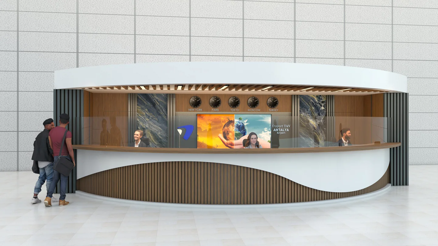 The Antalya Airport Domestic Terminal Information Desk was designed and implemented with a contemporary architectural approach that prioritizes clarity, functionality, and user comfort. The curved reception form, combined with wood textures, marble surfaces, and integrated digital screens, creates a balanced and prestigious identity within the terminal circulation. The layout ensures efficient passenger guidance while maintaining a strong visual presence from a distance. With its modern material palette and refined detailing, the project reflects Fraport TAV’s corporate standards while offering a welcoming and organized information experience for domestic terminal users.