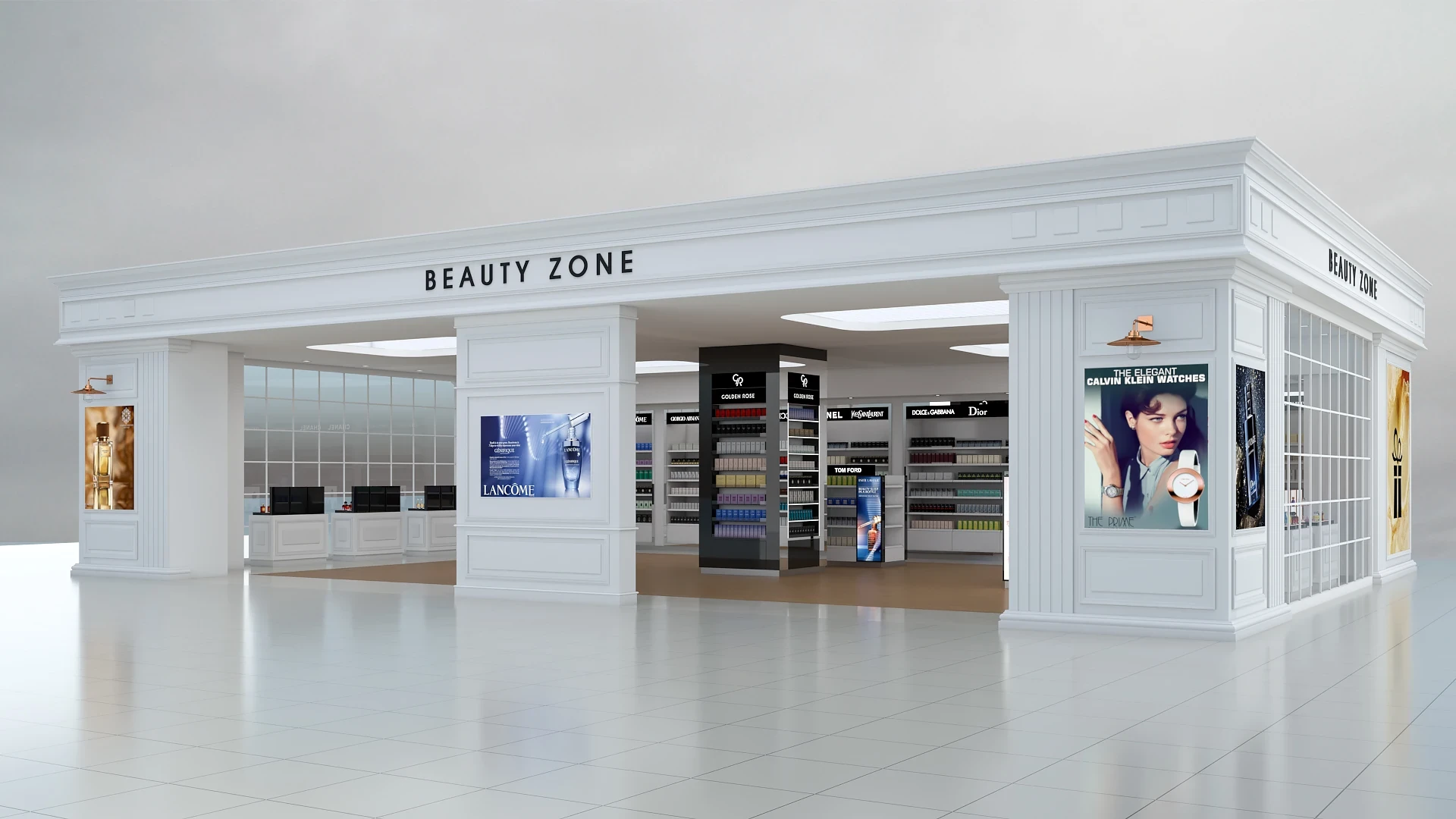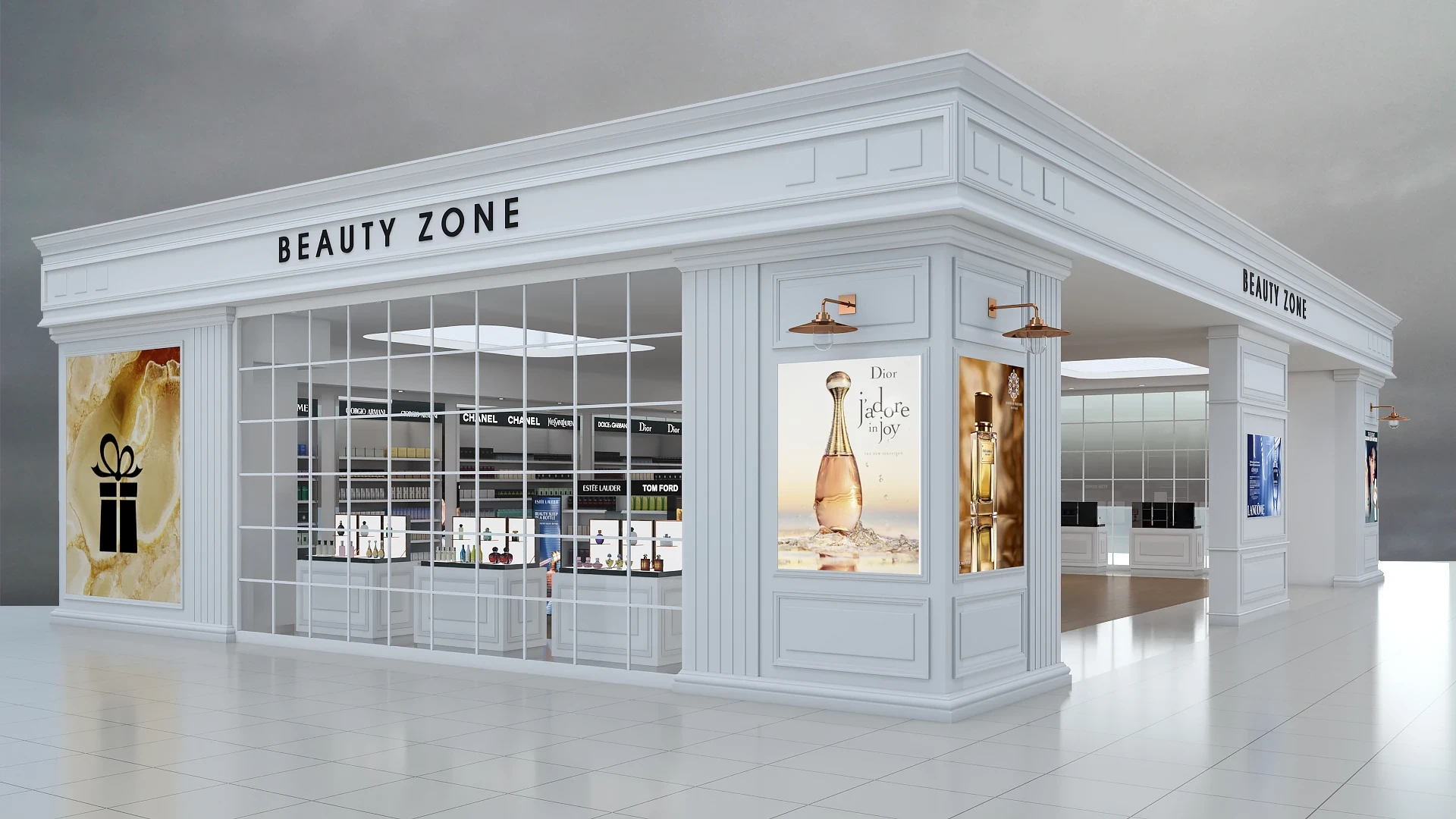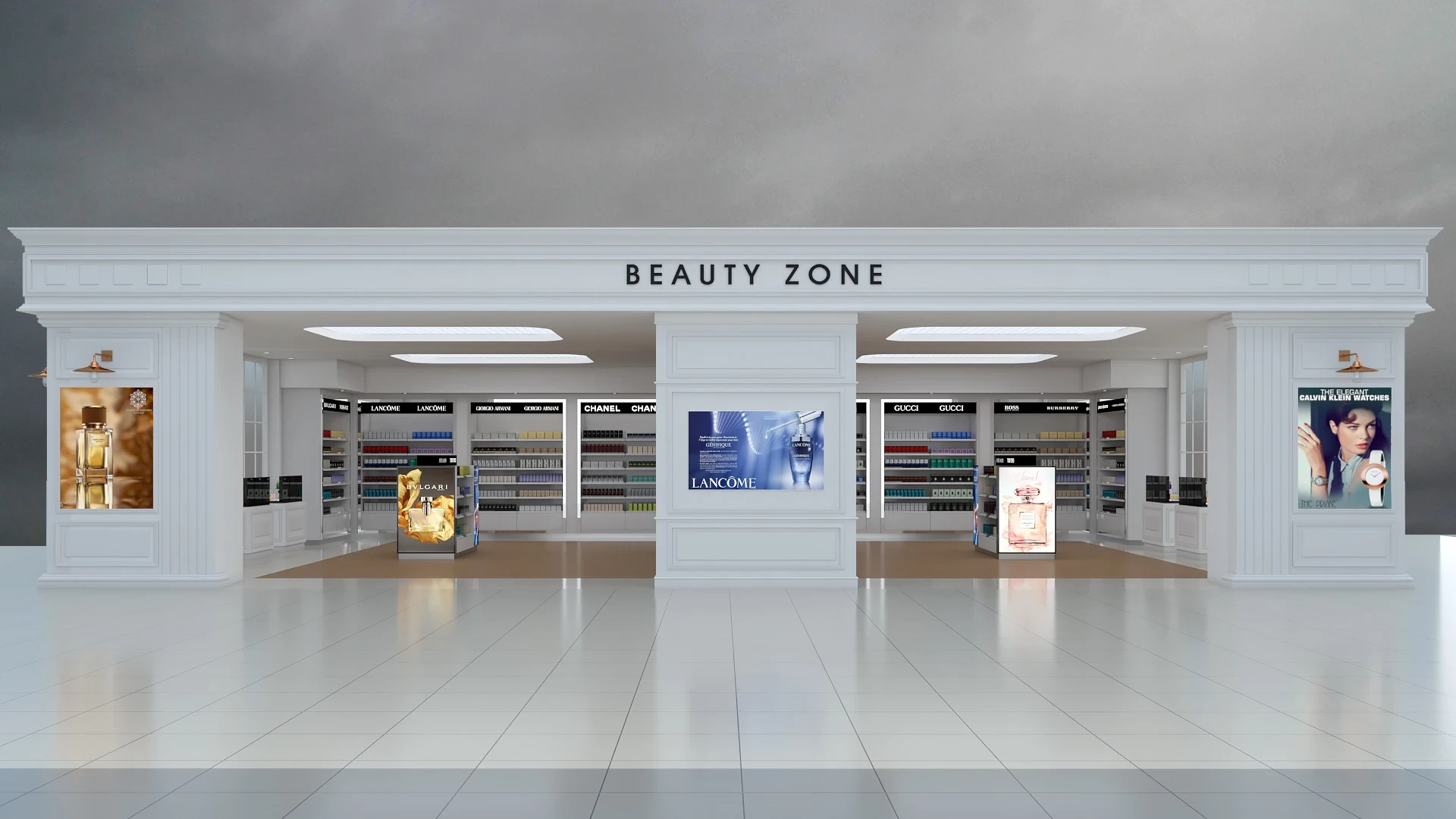 Located within the Antalya Airport T1 Terminal, the Beauty Zone Store project features a striking interior architecture designed to reflect the luxury identity of international cosmetics and perfume brands. The design combines classic white panelling with modern display details, creating a timeless and elegant atmosphere.