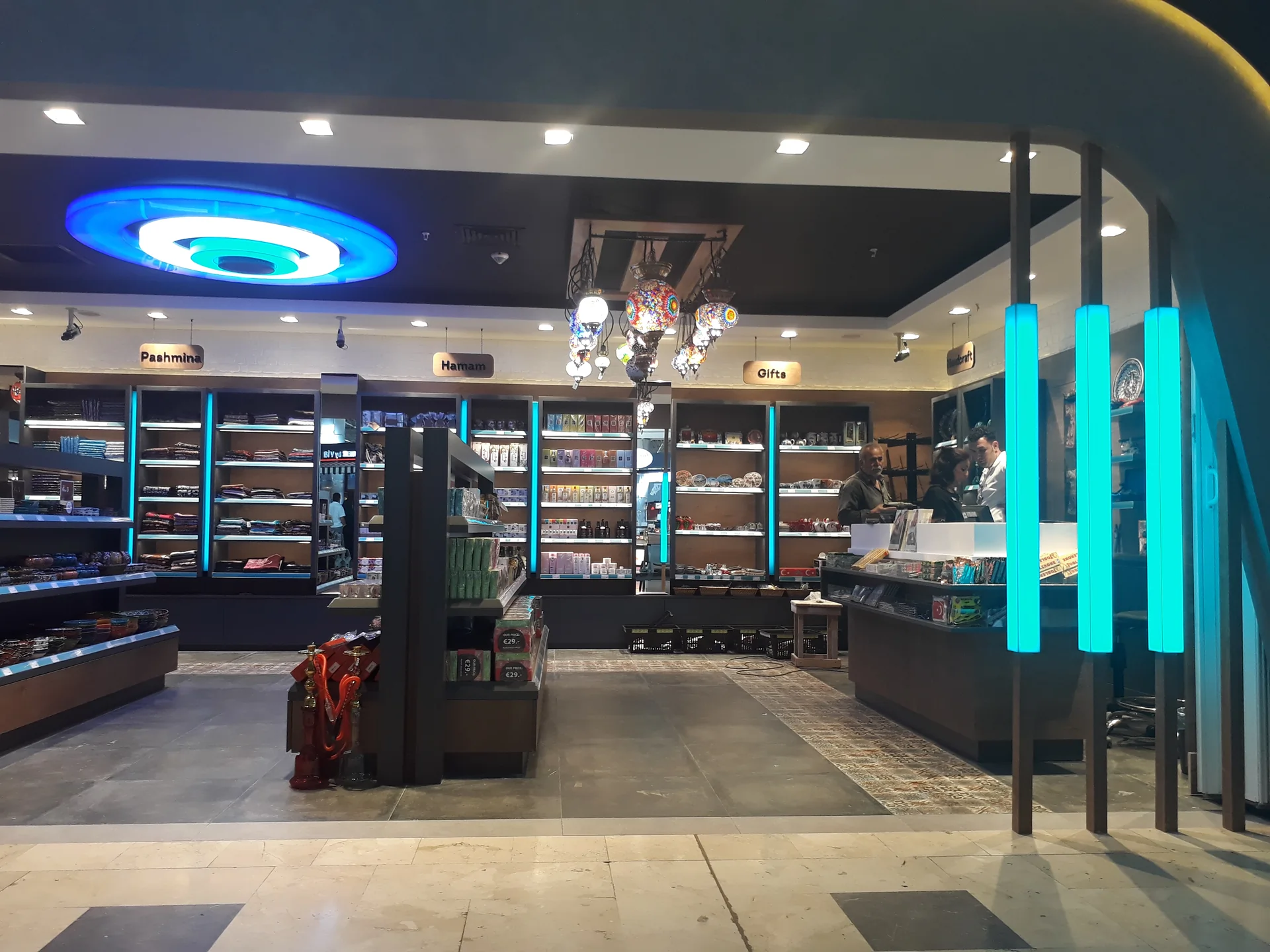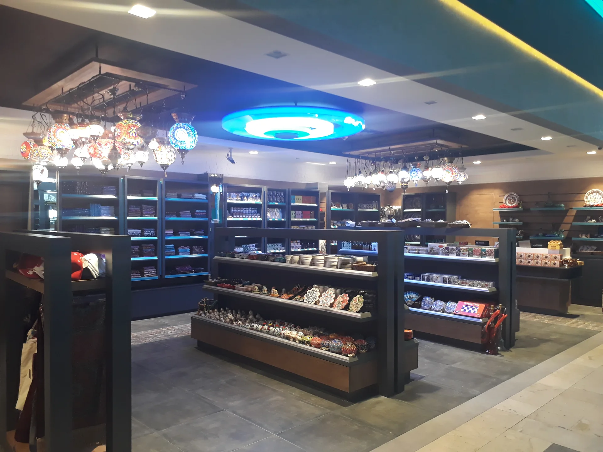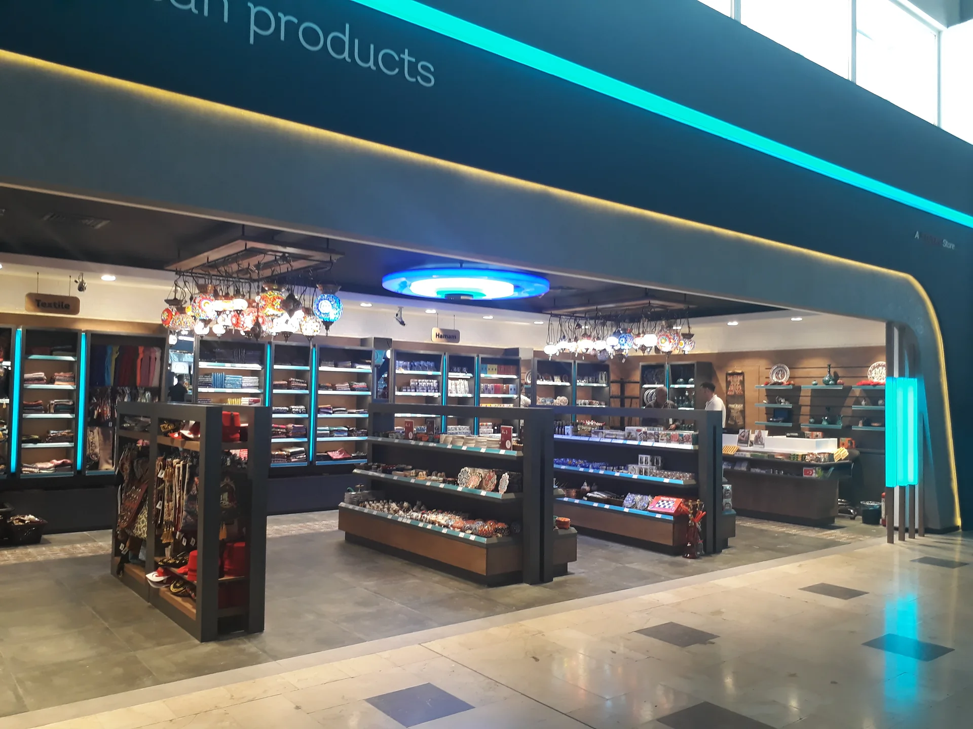 In this project covering the interior design and implementation of the Turkish ID Store at Antalya Airport, the presentation of traditional Turkish products became the main design concept. Furniture, lighting, and spatial details were shaped accordingly. Traditional motifs were combined with contemporary retail architecture to create a strong and brand-specific spatial identity.