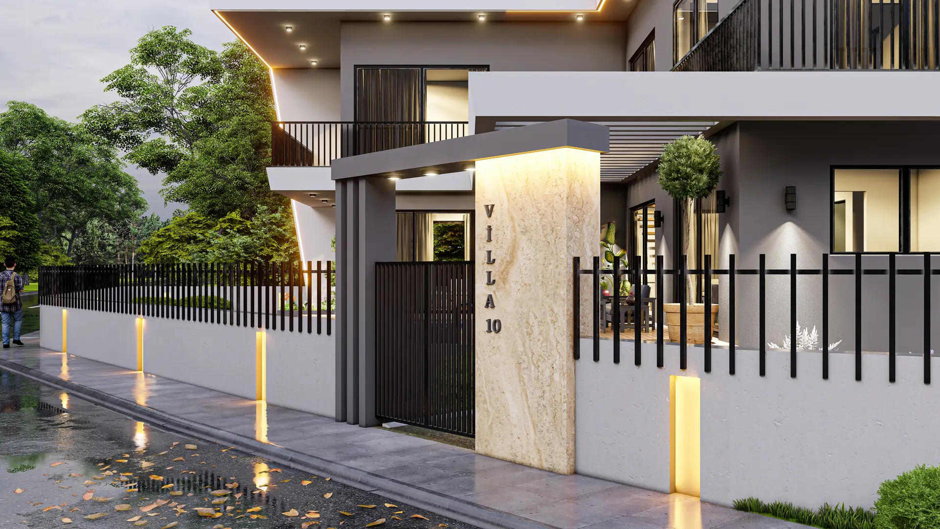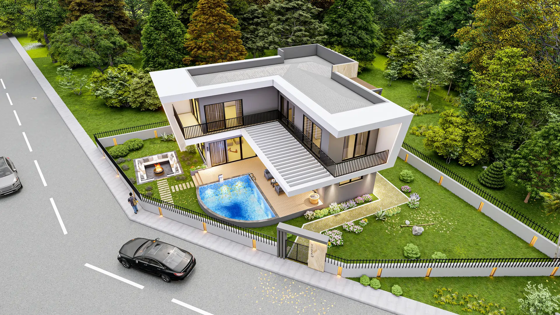 This villa project features a modern design emphasizing functionality with clean contemporary lines. Considering triangular site geometry, view axis, and wind direction, an optimal layout was achieved through an L-shaped plan. Natural stone textures, wood-look panels, and white façades add warmth and depth, while large glass surfaces strengthen indoor–outdoor connection, offering residents a spacious, peaceful, and privileged living experience.