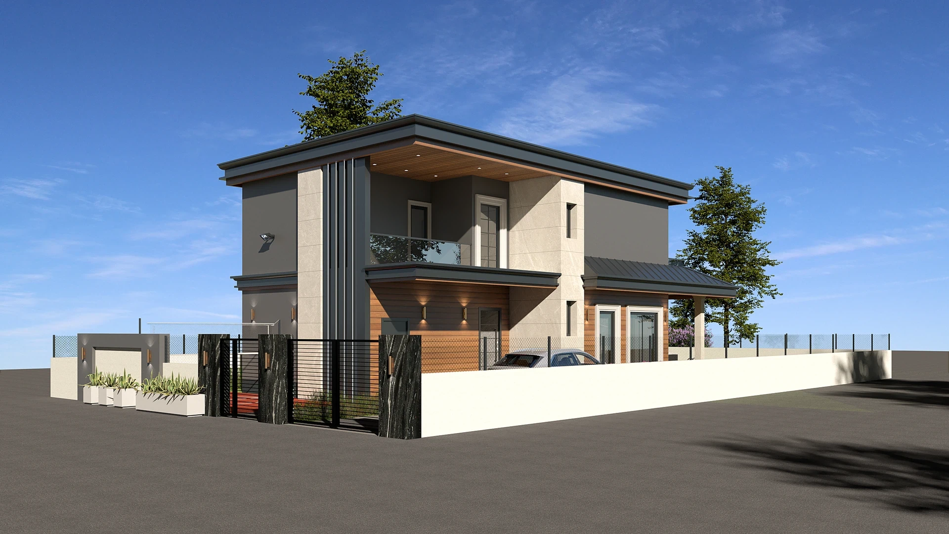 The simple mass is enriched with dark natural wood cladding and glass railings, while large ground-floor glass doors open living spaces directly to the outdoors, offering a spacious and fluid use. The design aims to provide residents with a peaceful and enjoyable life in close contact with nature.