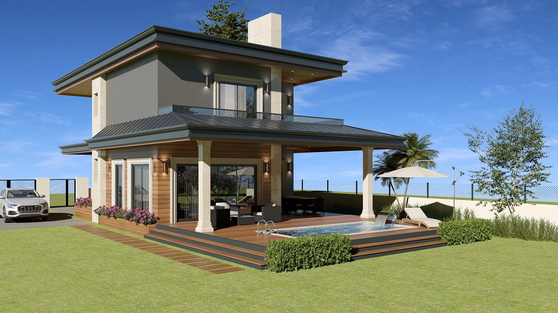This private villa project was designed in line with the client’s request for a traditional roofed house, reinterpreting classical roof forms with modern details. Large terraces, veranda, and pool areas integrate indoor comfort with outdoor living.